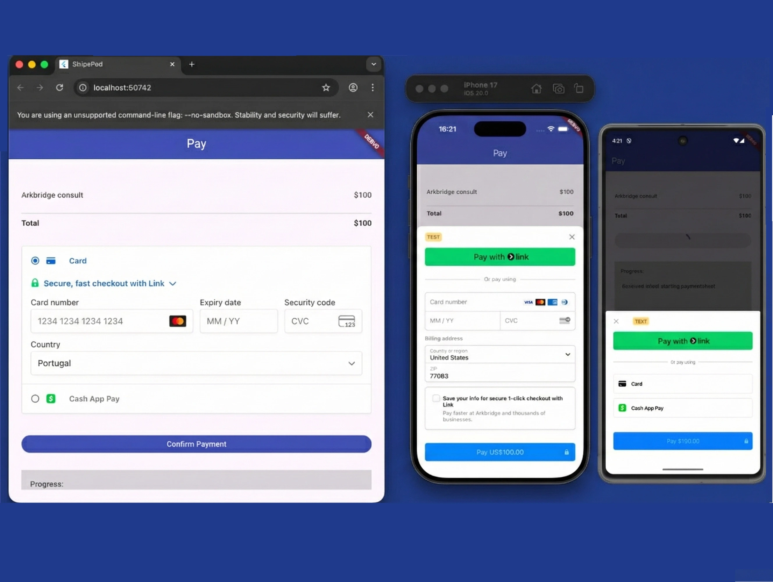 PaymentIntentvia the Stripe API and immediately logs a pending transaction record in the secure PostgreSQL database.App UI: The client-side, using the retrieved client secret, displays the native Stripe Payment Sheet (for iOS/Android) or the PaymentElement (for Web). This handles card details, Apple Pay, and Google Pay with native, trusted UI.